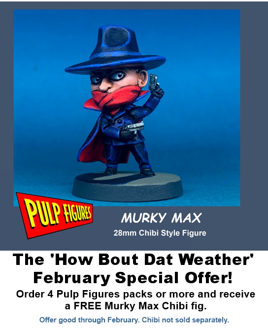 Some mugs’ll tell ya that playing with toy soldiers is for kids. After you knock’em flat, grab your dice and a mit full of Pulp Figures and join in the Rugged Adventure! .45s blazing, you can push these little character charged castings around the game table; fighting mad scientists, criminal kingpins or freakish flunkies until Ma calls you in for supper. If its liver and onions again I'd recommend pretending you didn't hear and go discover a lost city instead.