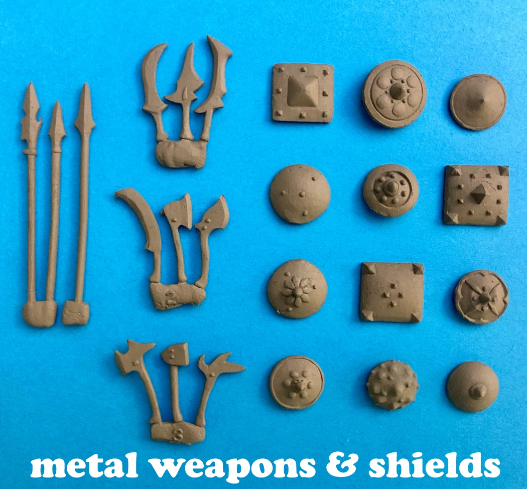 Nobgoblins sets come with a choice of Metal or Stone Age weapons and shields:
